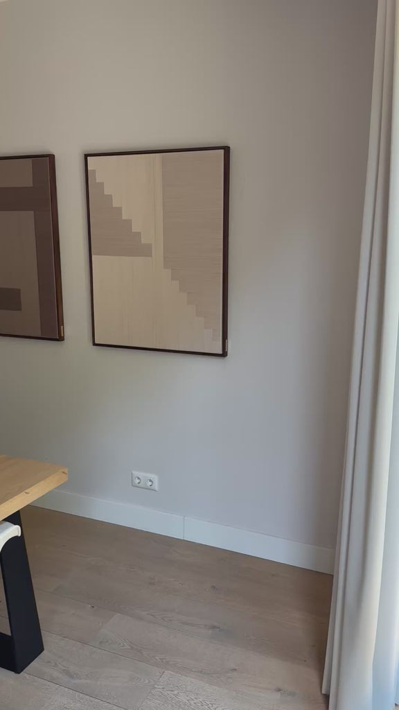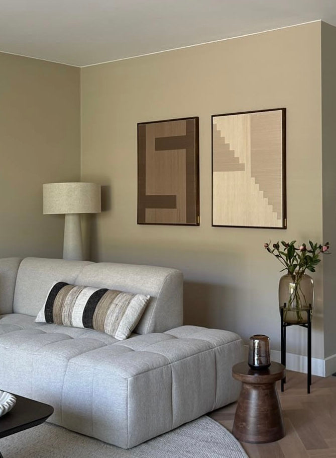 Yin, in een rijke tint Cloudy Cacao, voegt diepte en warmte toe met een strak patroon die krachtig maar subtiel is. Dao, uitgevoerd in ona warme beige, geeft contrast en rust. Hun gelaagde eenvoud maakt deze set ideaal voor liefhebbers van minimalistische kunst en een neutraal kleurenpalet.