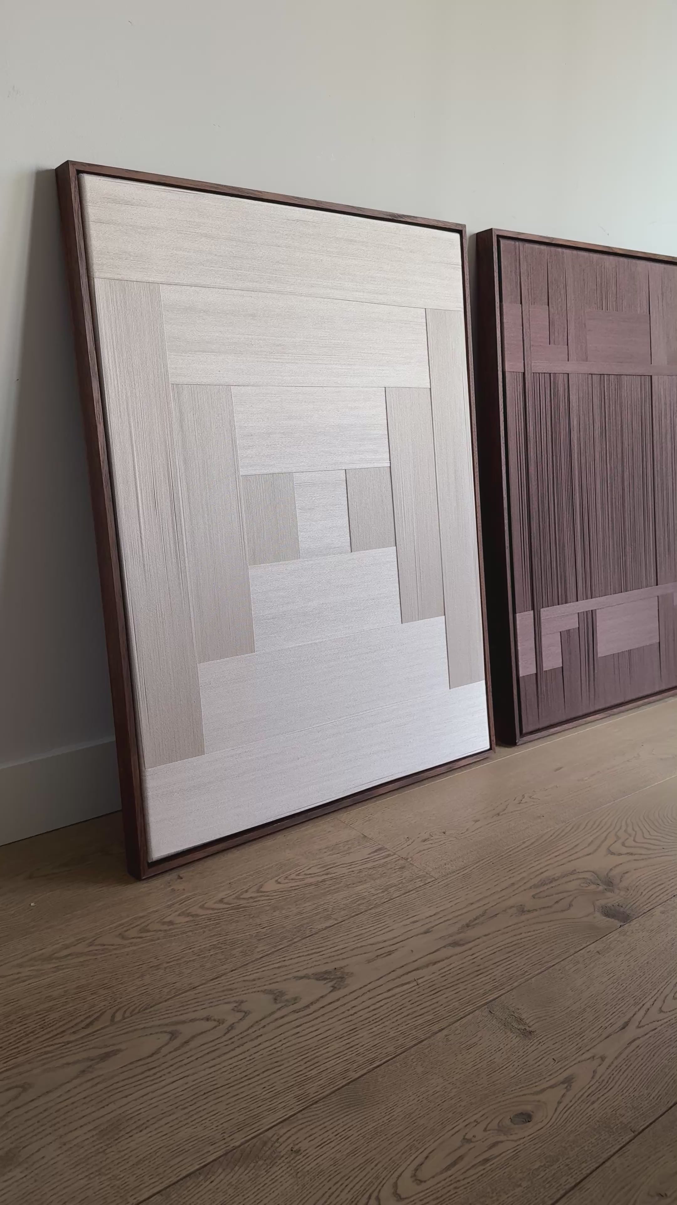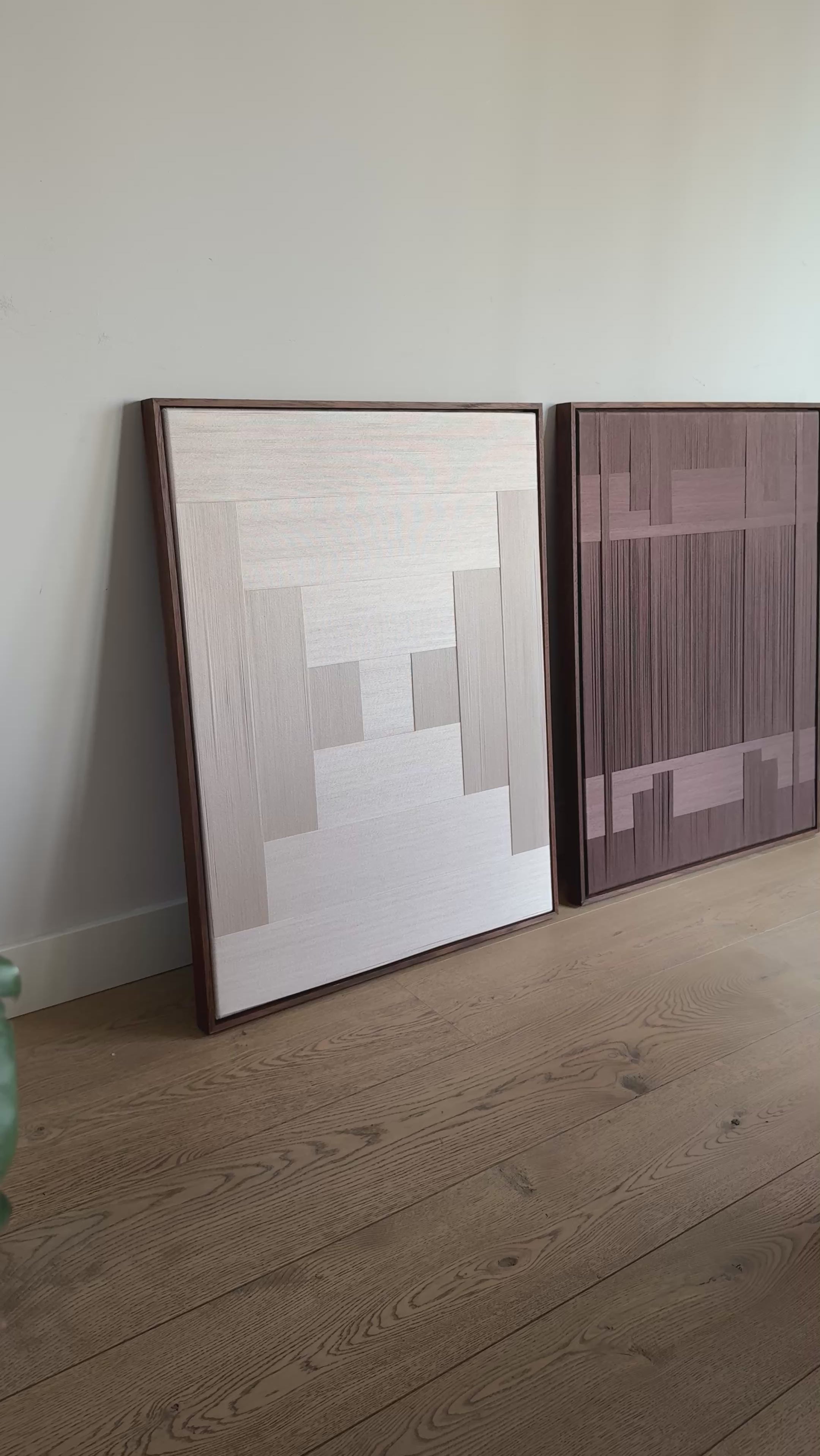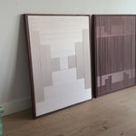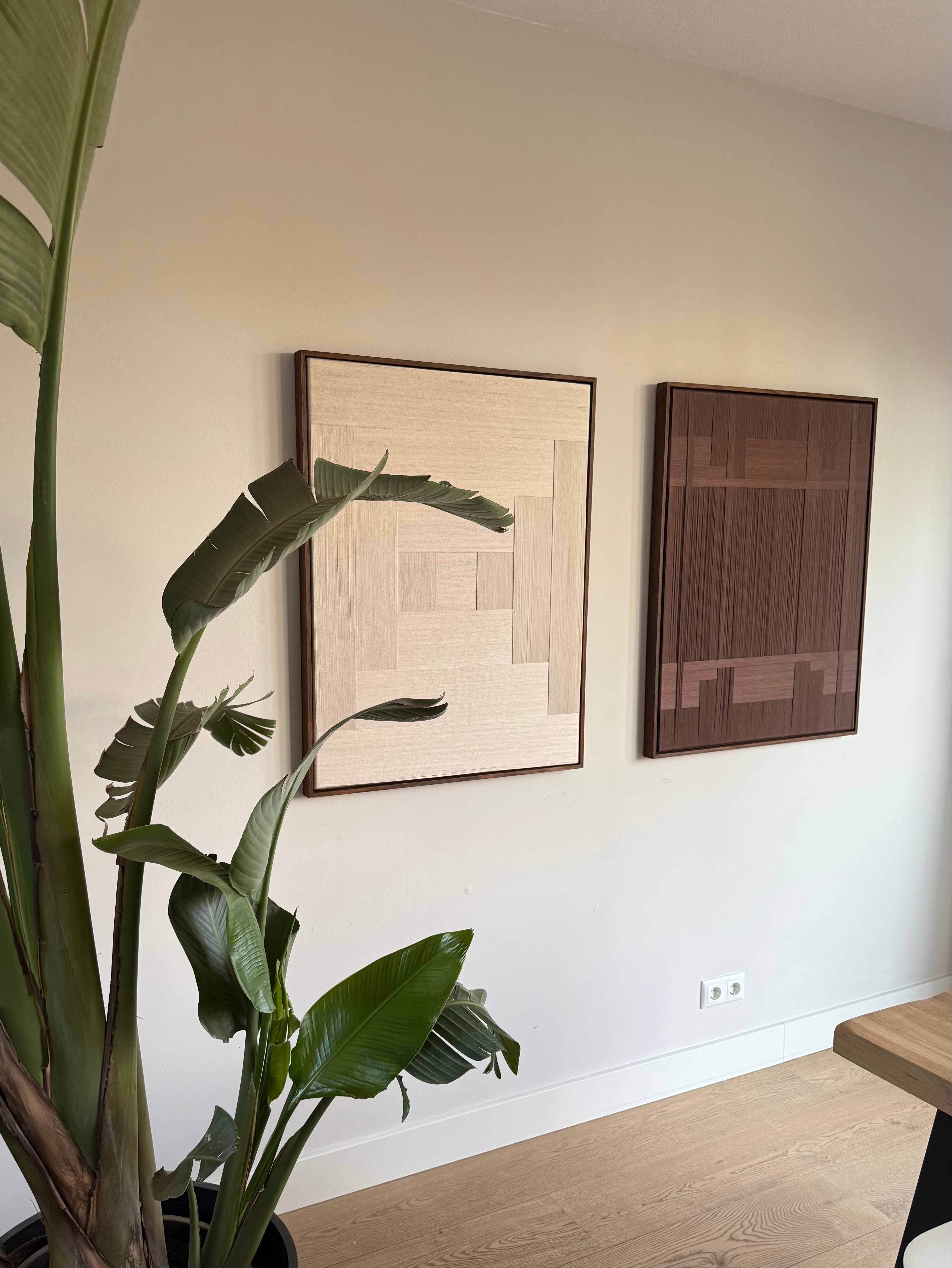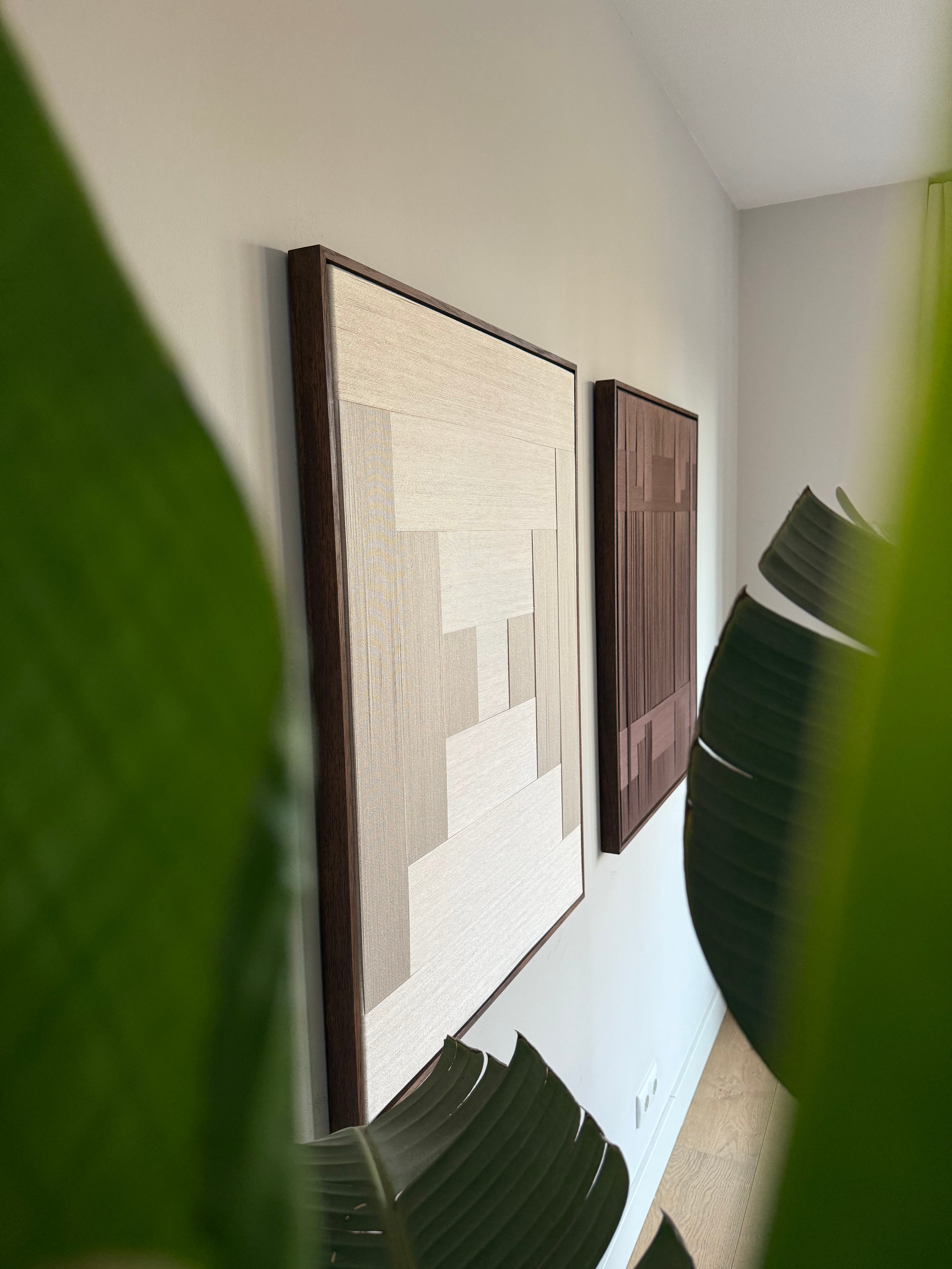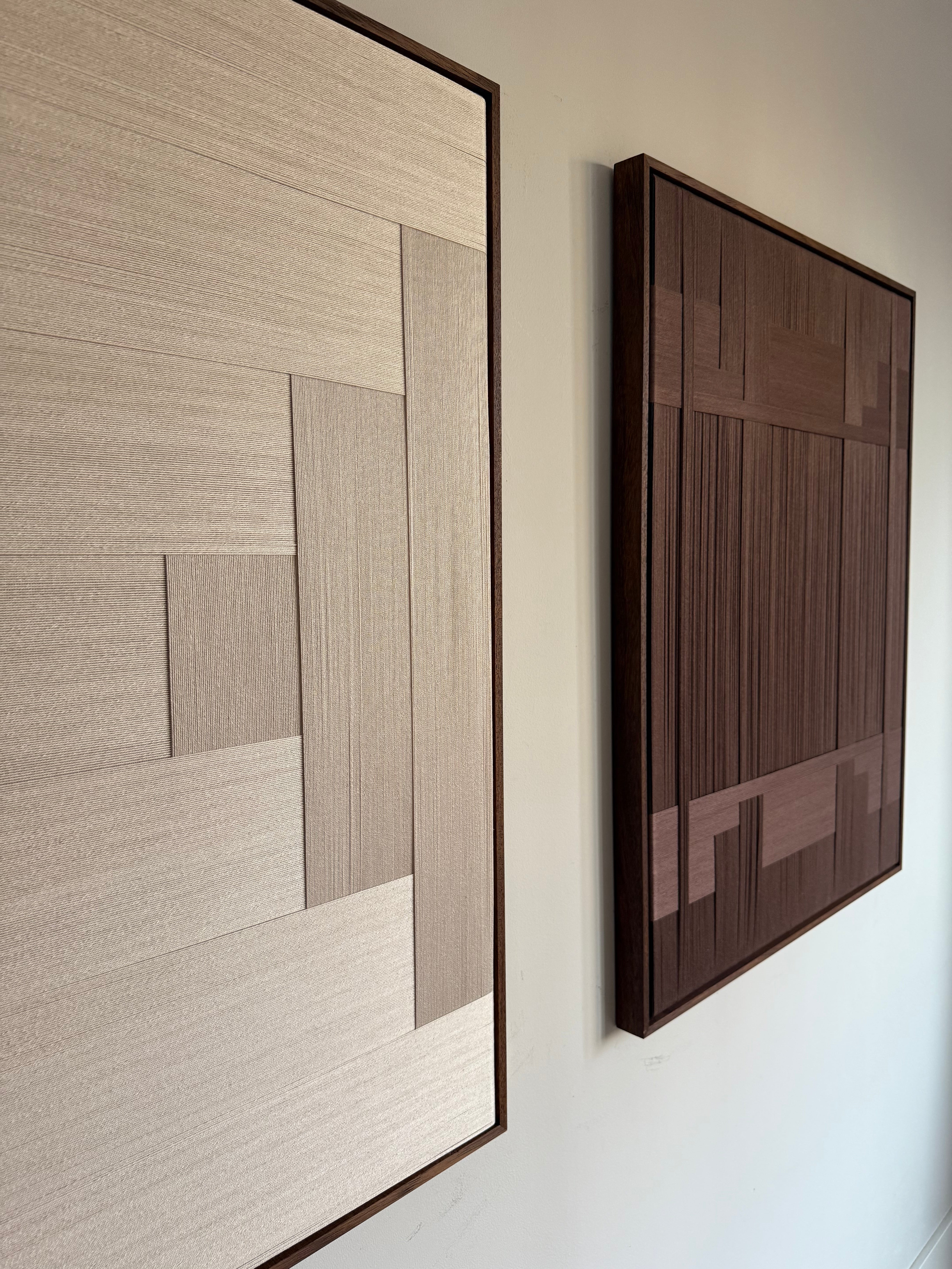 Volledig met de hand gecreëerd uit verfijnde katoenen garen en gespannen op canvas, toont dit duo het herkenbare Stripe Studio handschrift: rijk in textuur, verfijnd in afwerking en tijdloos in uitstraling. De combinatie van natuurlijke kleuren en handgemaakte lijnen maakt dit tweeluik ideaal voor interieurs die rust, warmte en natuurlijke tinten omarmen.