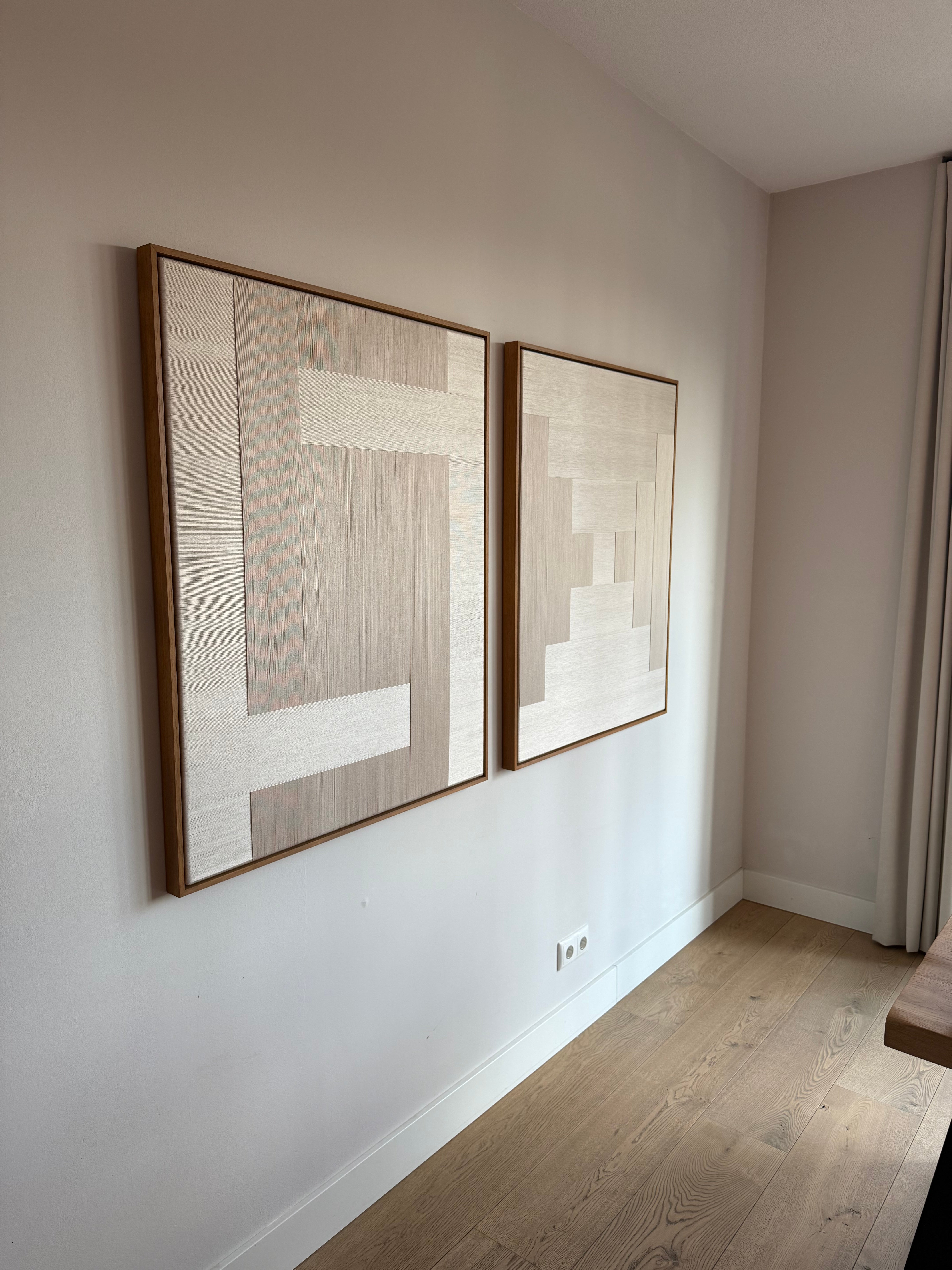 De combinatie van de natuurlijke kleur beige en brede banen maakt dit tweeluik ideaal voor interieurs die rust, warmte en natuurlijke tinten omarmen.