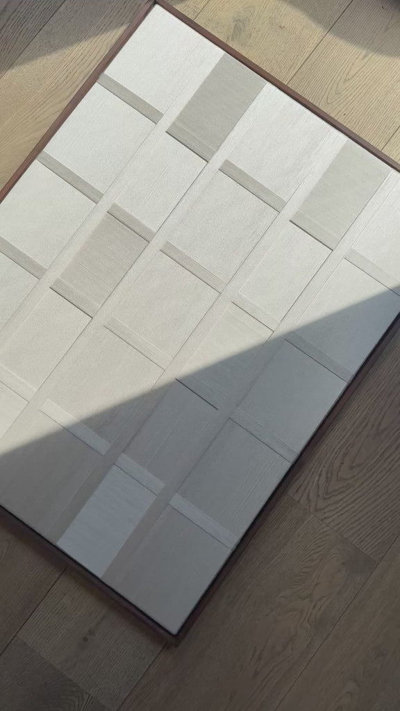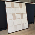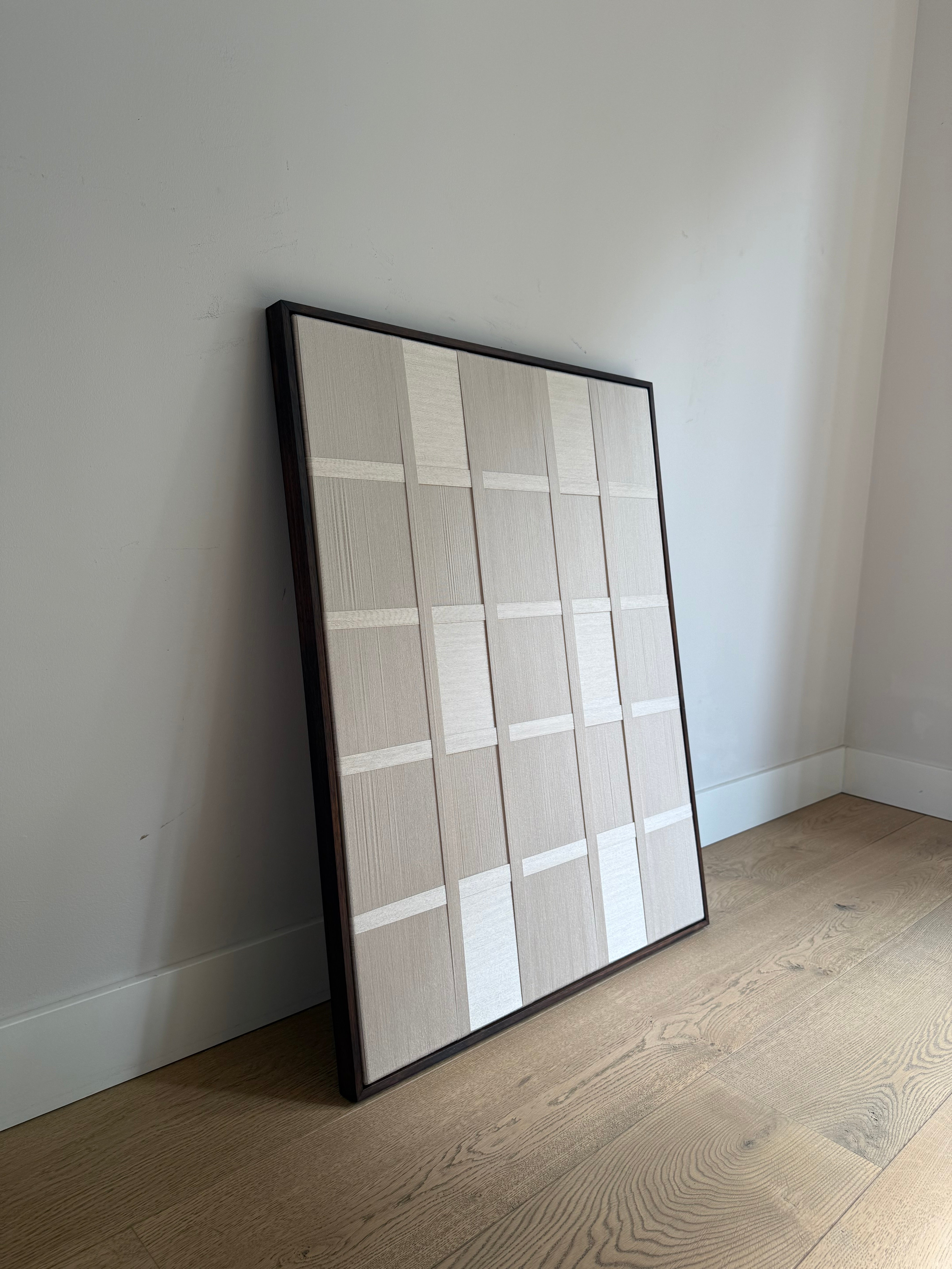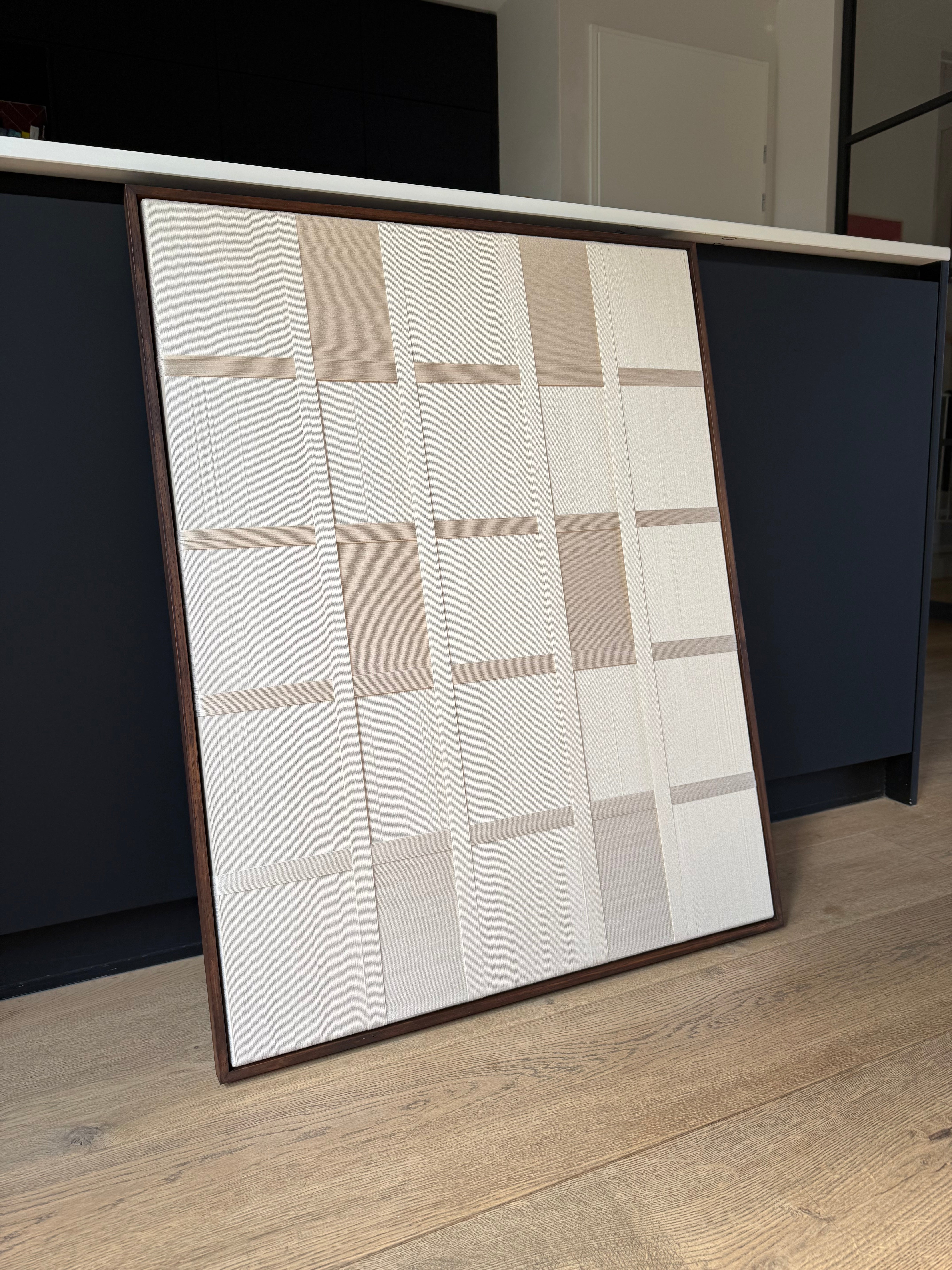 In het voorbeeld zie je artwork masu in beige, maat 93 x 73 cm, walnoot lijst. Deze maat is perfect voor grote wanden of gecombineerd als duo artwork. Dit patroon geeft een krachtig statement aan je muur!