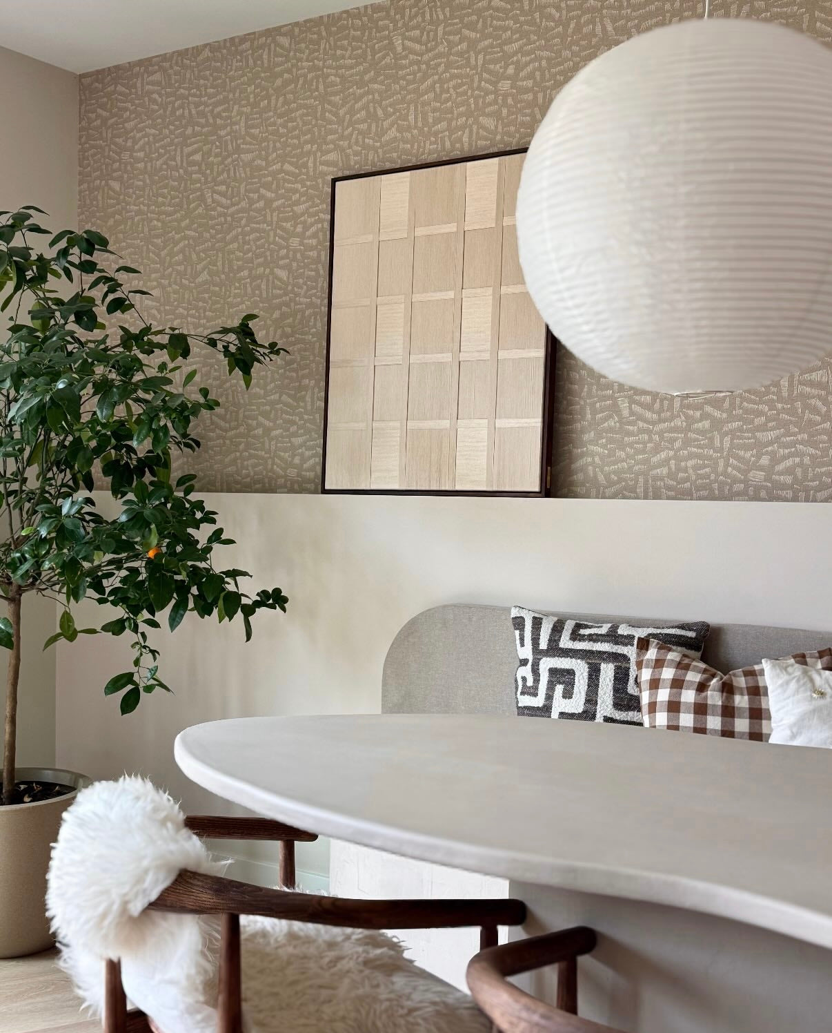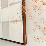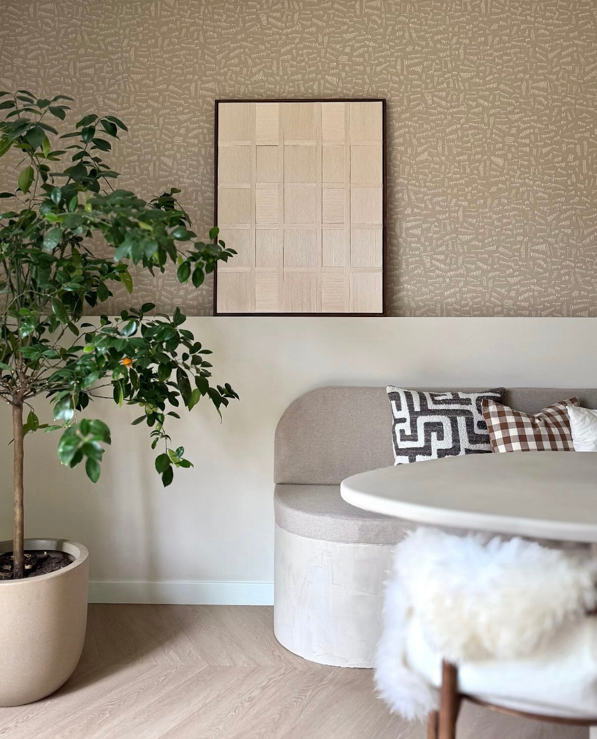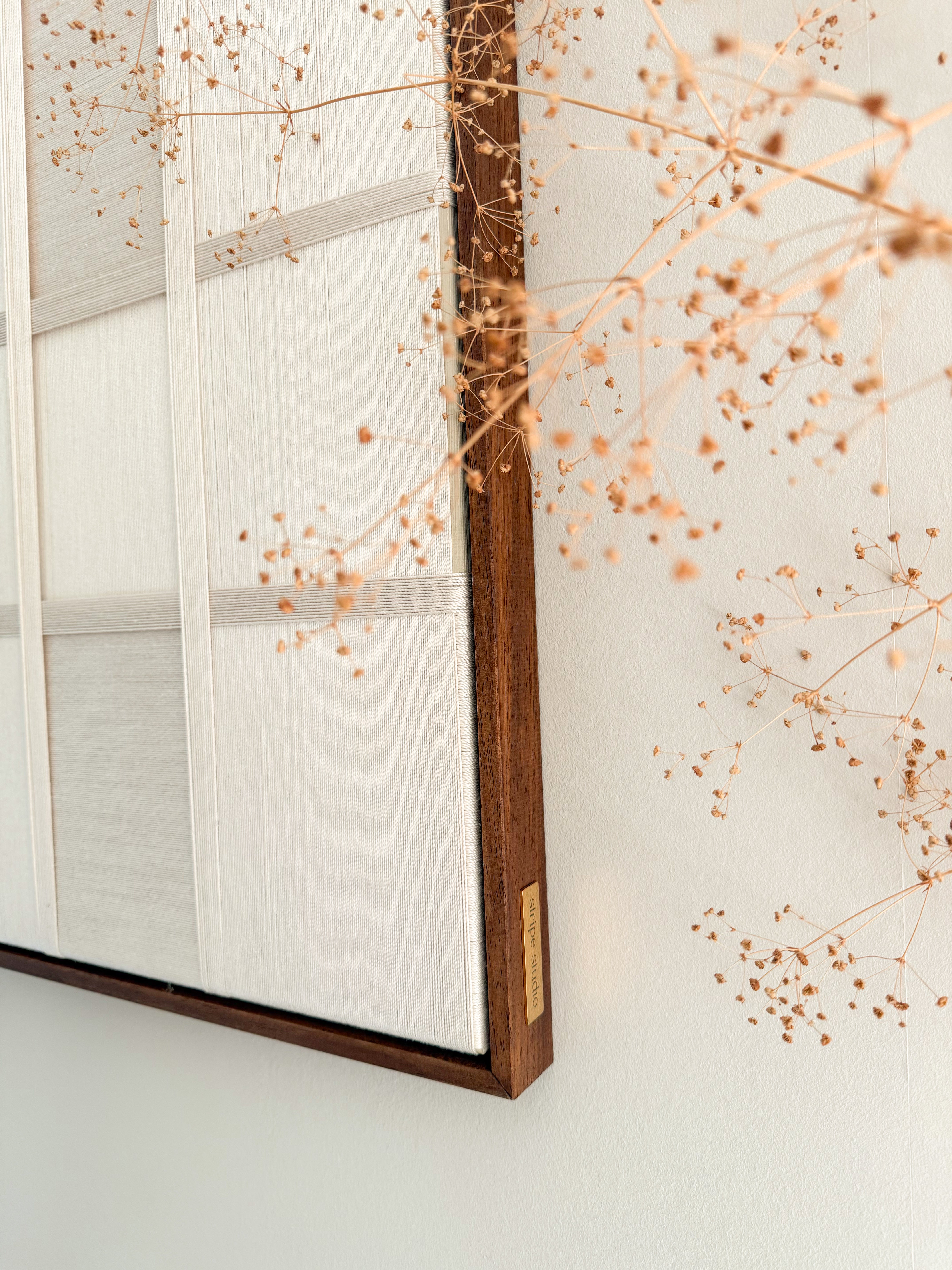 In het voorbeeld zie je artwork masu in beige, maat 93 x 73 cm, walnoot lijst. Deze maat is perfect voor grote wanden of gecombineerd als duo artwork. Dit patroon geeft een krachtig statement aan je muur!