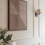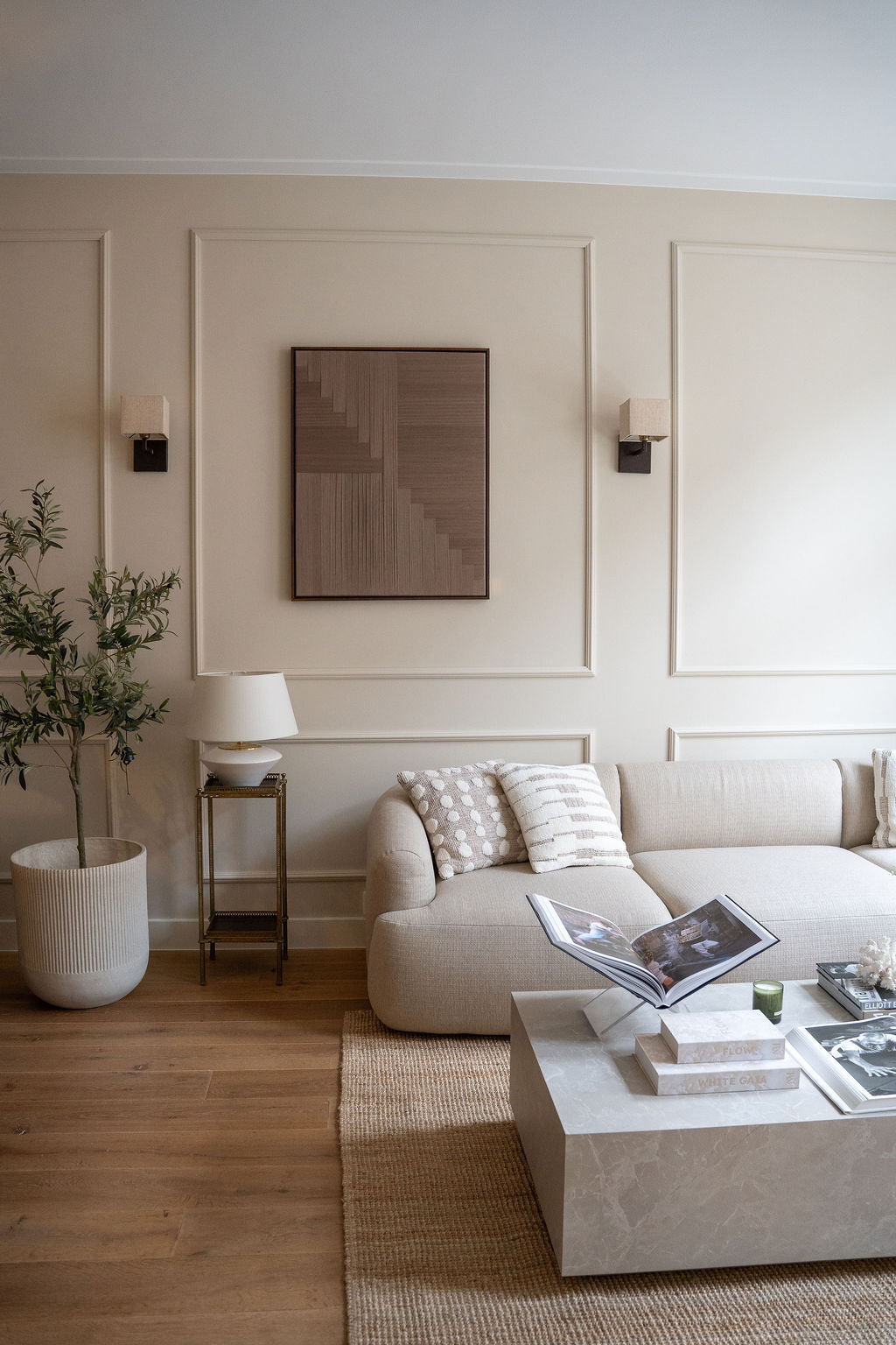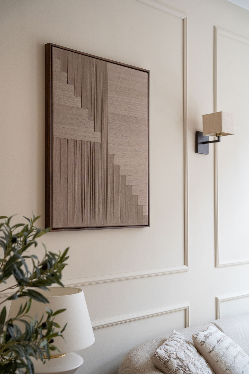 In het voorbeeld zie je artwork dao in beige, maat 93 x 73 cm, walnoot lijst. En artwork dao in burgundy, maat 103 x 83 cm, walnoot lijst. Deze maten zijn perfect voor grote wanden of gecombineerd als duo artwork. Dit patroon geeft een krachtig statement aan je muur!
