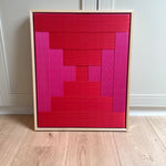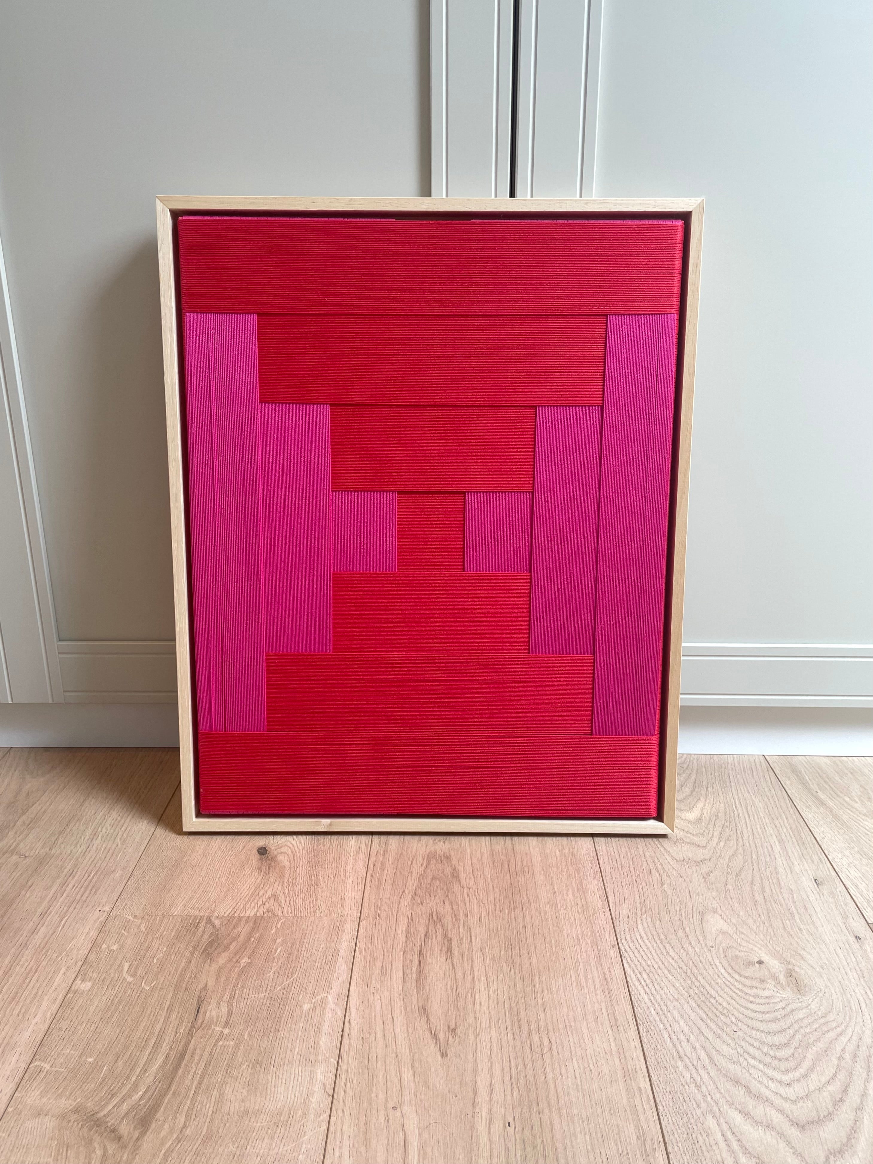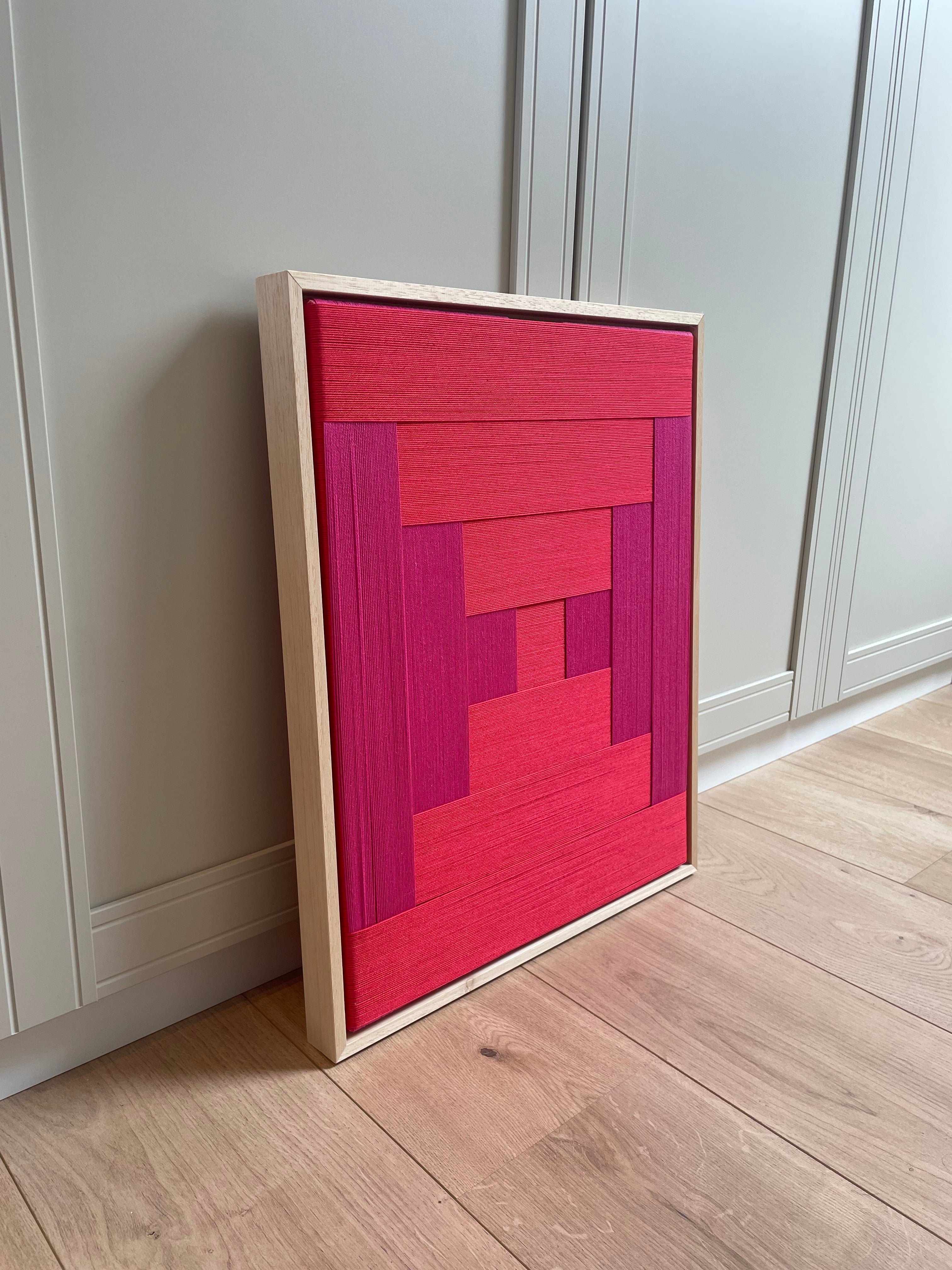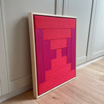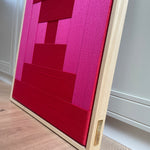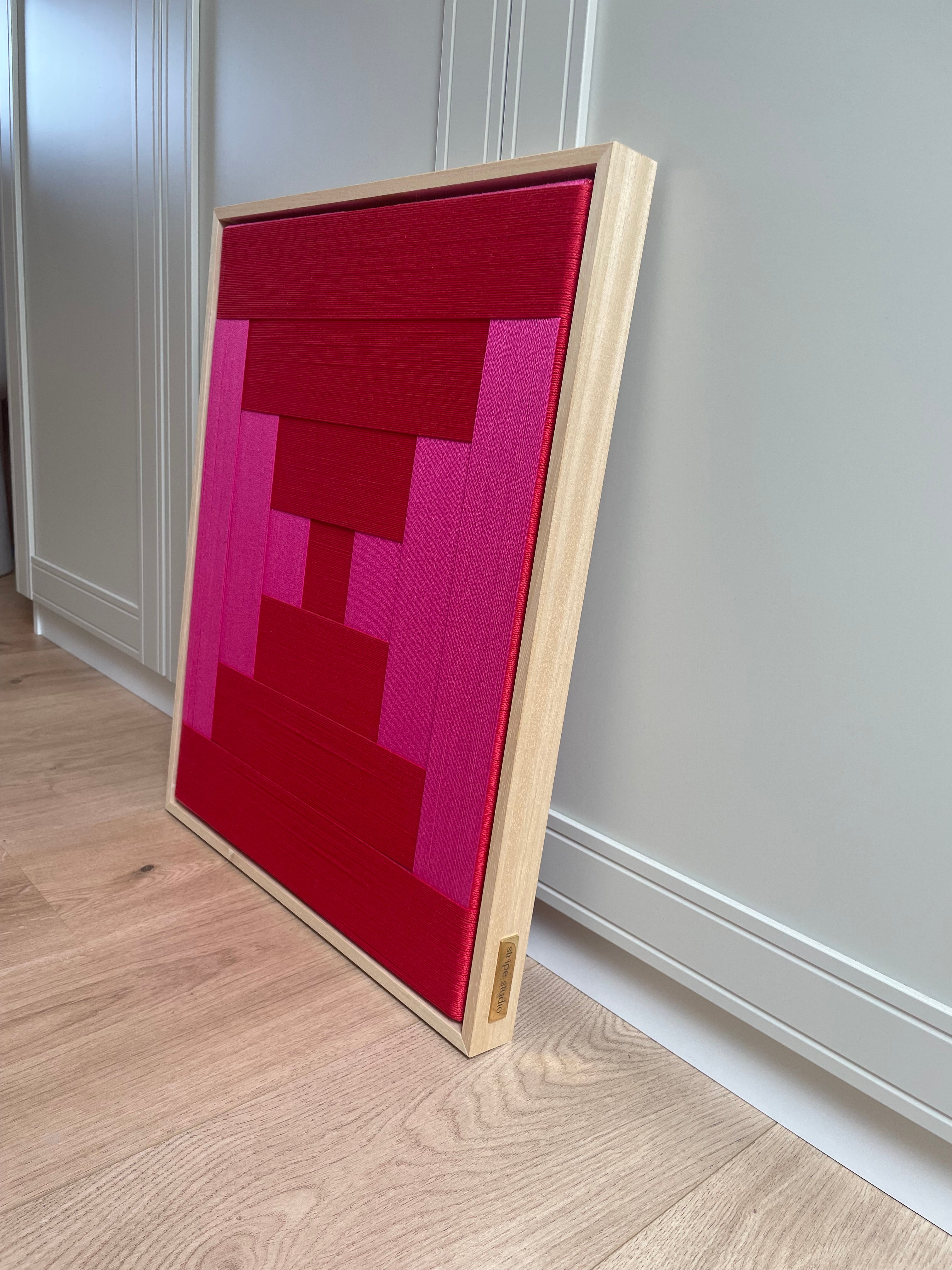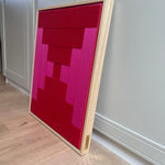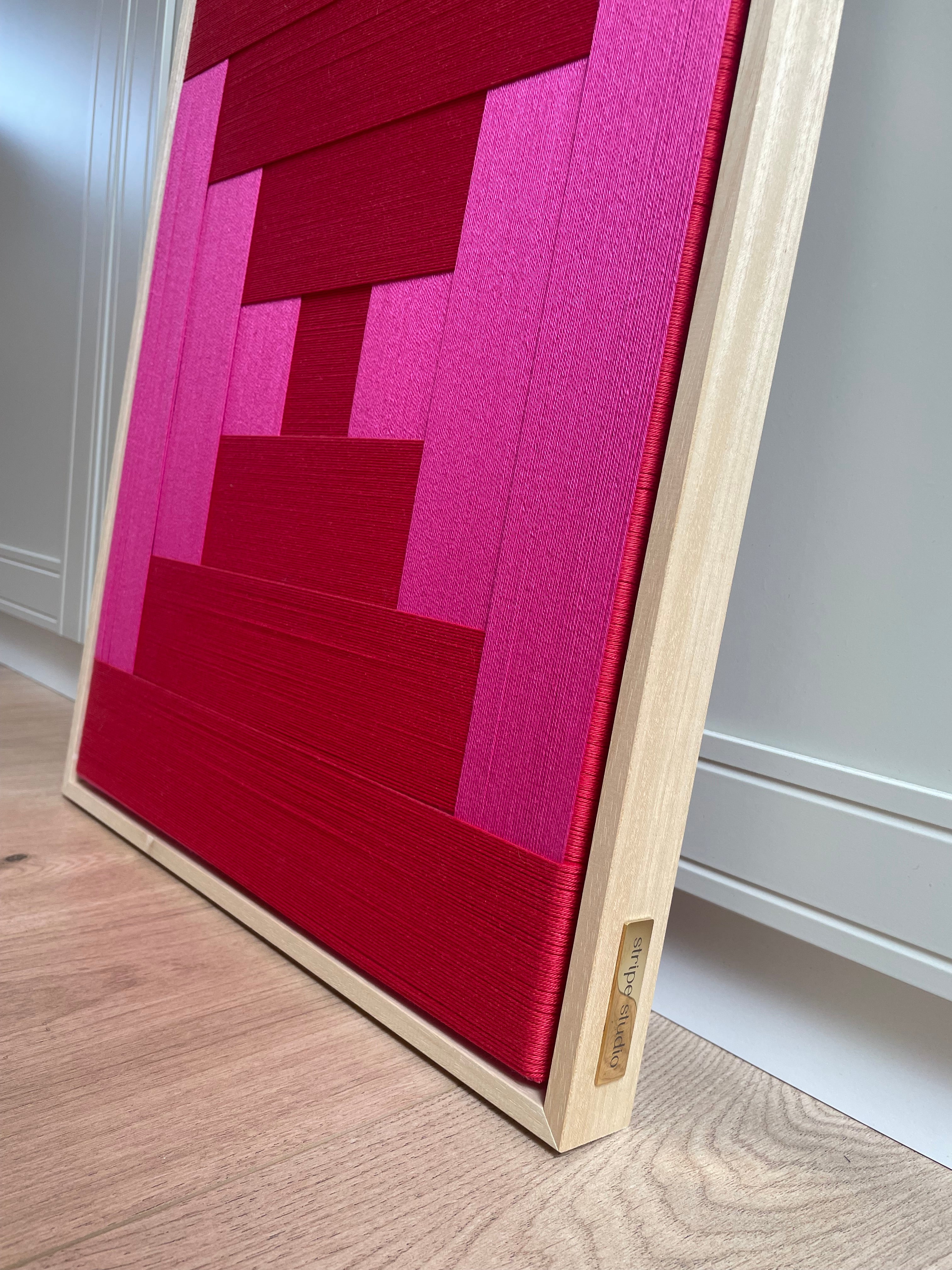 Op voorraad: Artwork qi in de kleur pure red & magenta. Maat: 53 x 43 cm. Het werk heeft een blank houten lijst, afgewerkt met gouden Stripe Studio logo.