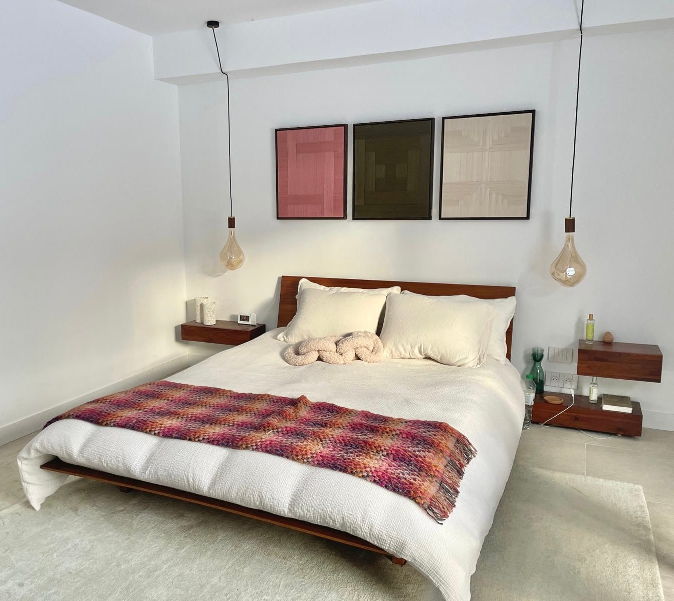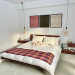 De tinten matchen perfect bij elkaar en geven contrast door het kleurgebruik, diepgang door de patronen en textuur door het katoengaren. Hang ze naast elkaar op, of juist speels aan de muur door twee werken onder elkaar te plaatsen, en één werk in het midden van die twee werken.