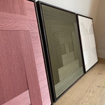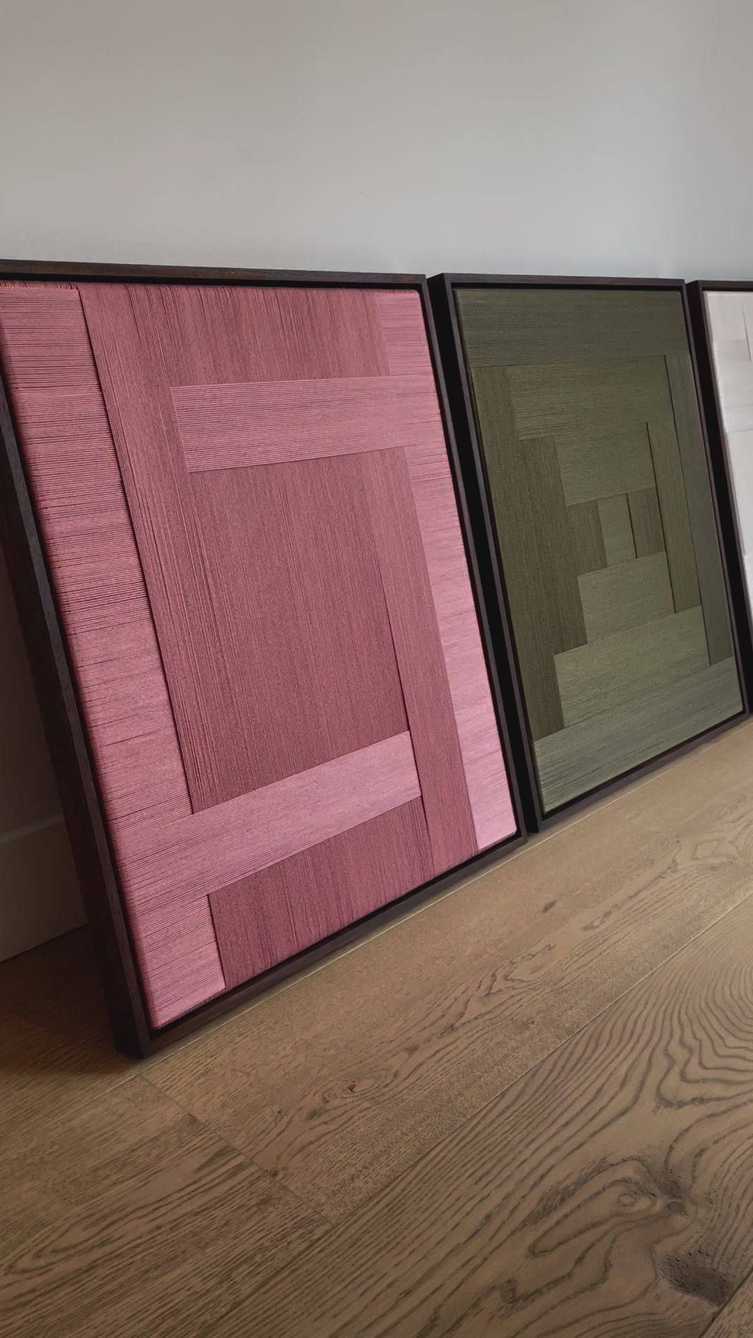Op het voorbeeld is 3x 63 x 53 cm, yin in pink terracotta, qi in olive green en moxa in beige, walnoot houten lijst